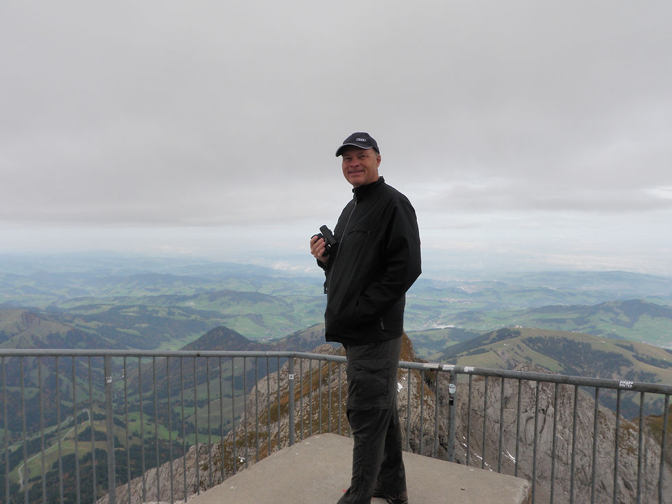 When we woke up in Appenzell, it was overcast, and in short order it was raining hard. In the hotel dining room, we enjoyed breakfast which included 3 Appenzeller cheeses, of course! They were delicious! I spent some time working on the computer to create yesterday's blog. By the time we were ready to leave Appenzell, it had stopped raining. Our little convertible was all loaded up with the top up. We began driving through the Switzerland countryside past bright green hillsides dotted with chalets and an occasional grouping of soft-eyed cows, bells ringing from their necks. The fall colors are out. It is so beautiful and bucolic you can't imagine. Before long, we reach one of our destinations, Schwagalp, where we will catch a tram to the top of Mount Santis. It is overcast but no longer raining here either.