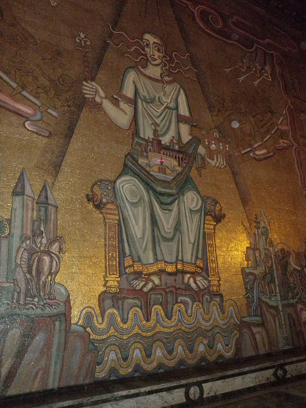 Our first stop was City Hall. This place is notable because it hosts a banquet for Nobel Prize winners every year in its "Blue Room". The Blue Room was immense but a little bit dull. The "Gold Room", on the other hand, was anything but dull! It features beautiful gold mosaics. This mosaic shows the Malar Queen: