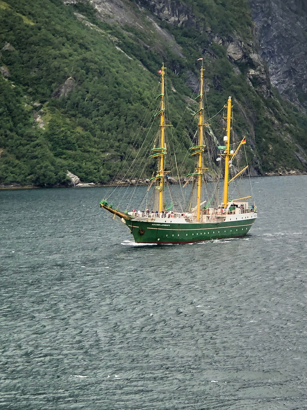 I woke up at 6:00 a.m. to watch the scenery go by as we entered the fjord on the way to Geiranger. We passed picturesque waterfalls and steep cliffs.